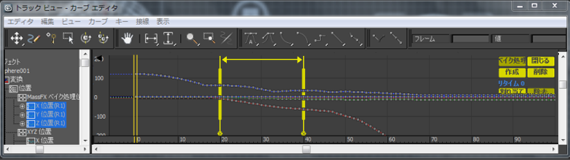 ハイライト表示されたトラックからキーとカーブのみが表示されているのがわかります。その名前は[X 位置](X Position)(R1)と[Y 回転](Y Rotation)(R1)に変化しています。 これは、トラックがリタイマ 1 の制御下にあることを示します。