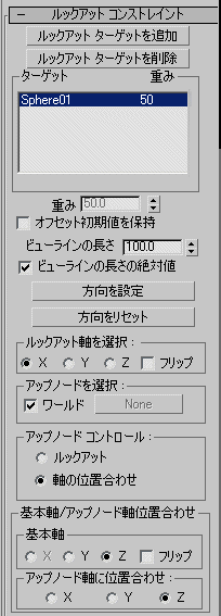 ルックアット コンストレイントを割り当てると、[モーション](Motion)パネルの[ルックアット コンストレイント](LookAt Constraint)ロールアウトでそのプロパティにアクセスできます。[ルックアット コンストレイント](LookAt Constraint)ロールアウトでは、ターゲットの追加と削除、重みの割り当て、ターゲットの重みの値の割り当ておよびアニメート、他の関連するパラメータの調整を行うことができます。