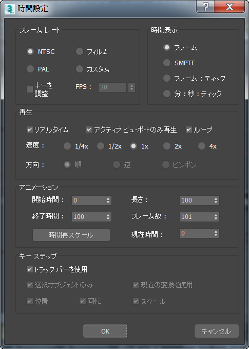タイム スライダおよび 3ds Max 全体を通して使用する時間の表示方法を指定します(指定できる単位は、[フレーム数](Frames)、[SMPTE]、[フレーム: ティック](FRAME: TICKS)、[分: 秒: ティック](MM:SS: TICKS))。