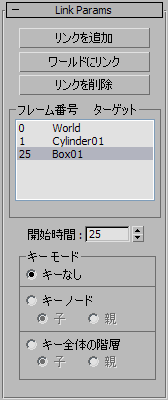 トラック バーまたはトラック ビューでキーを操作して、リンク フレームのアニメーションを修正することもできます。ただし、通常のキーを削除する方法ではリンク キーは削除できません。リンク キーを削除するには、[Link Params]ロールアウトの[リンクを削除](Delete Link)を使用する必要があります。