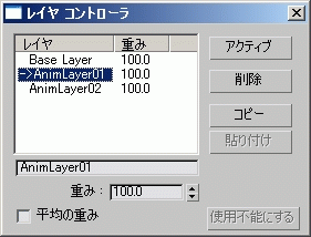 後続のアニメーション キーを受け取り、重みを調整するようにレイヤを指定するには、リストでレイヤをハイライト表示し、[アクティブ](Set Active)をクリックします。 アクティブなレイヤは、リスト内では矢印付きで表示されます。