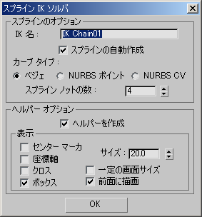 このダイアログ ボックスでは、作成するスプラインのボーン構造を制御するパラメータを設定します。各ノット(コントロール ポイント)のヘルパー オブジェクトの位置によって、順々にスプラインが形成されます。