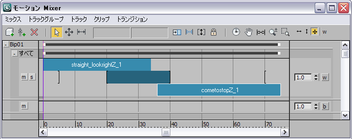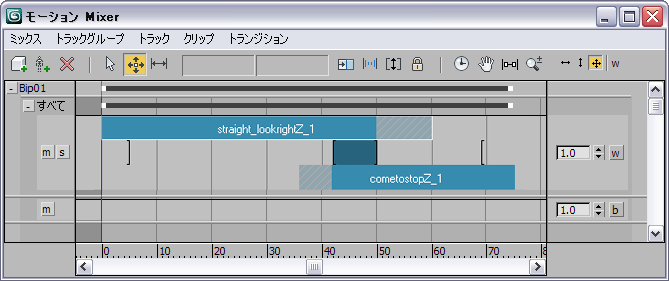 モーション フローと同様に、ミキサーでも、足ベースのモーション クリップ(IK コンストレイントによってさまざまな時点で足が接地するクリップ)間のトランジションは、アニメーションができるだけ自然になるように注意深く配置および調整する必要があります。ワークフローは、Biped をアニメートしているか、あらかじめ用意されたキャラクタなどの 3ds Max オブジェクトをアニメートしているかに依存します。