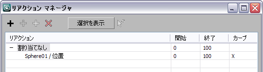 リアクション コントローラには、位置リアクション、回転リアクション、Point3 リアクション、スケール リアクション、浮動リアクションの 5 つの種類があります。リアクション コントローラは、シーン内のアニメート可能などのトラックにも割り当てることができます。リアクションは時間ではなく、位置や回転などシーン内の他の変数を基準とします。