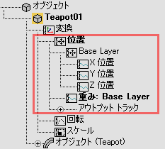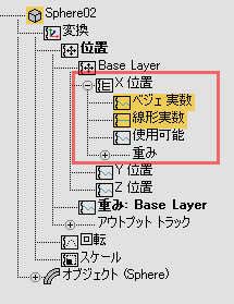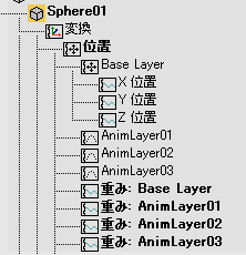 アニメーション レイヤを有効にする場合はコントローラ名が一部変更されるため、再マップが必要です。たとえば、アニメーション レイヤを有効にする前の球の[X 位置](X Position)トラックが Sphere01¥Transform¥Position¥X Position の場合、アニメーション レイヤを有効にした後の球の[X 位置](X Position)トラックは、Sphere01¥Transform¥Position¥Base Layer¥X Position に変更されます(コントローラ名にレイヤ名が挿入されます)。
