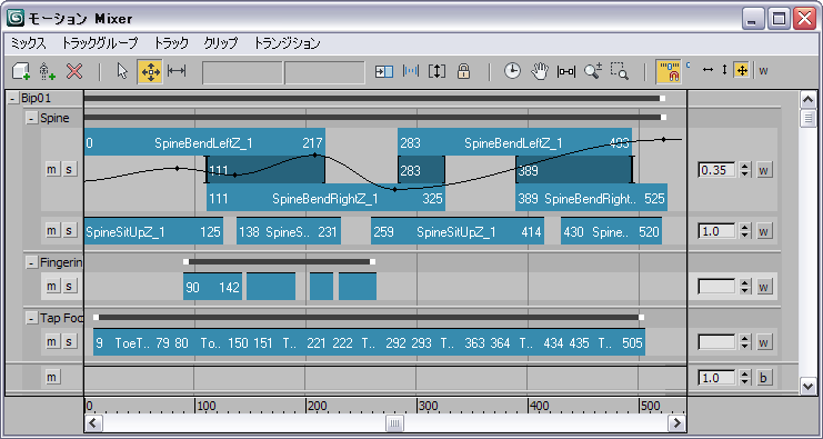 モーション Mixer を使用すると、Biped および Biped 以外のオブジェクトのモーション ファイル(BIP ファイルと XAF ファイル)を結合できます。これらのモーション ファイルは、「クリップ」とも呼ばれます。