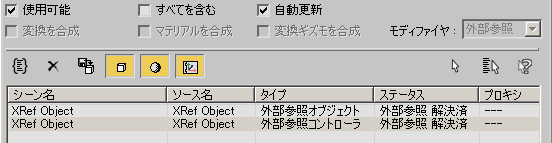 外部参照コントローラを削除するには、外部参照エンティティ リストでエントリを右クリックしてコンテキスト メニューから[シーンに合成](Merge in Scene)を選択するか、新しい変換コントローラをオブジェクトに割り当てます。