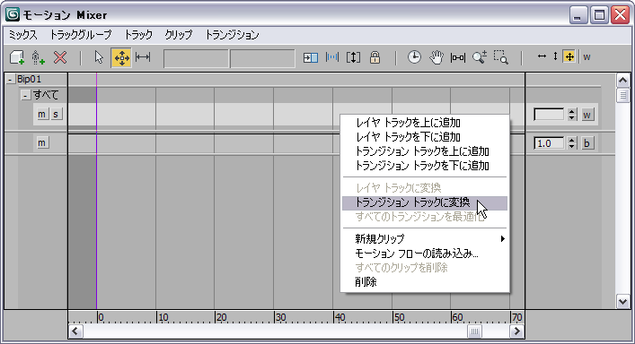 モーション間にトランジションが必要ない一連のモーションのためのトラックです。既定値では、ミキサーを開くと、Biped 用にレイヤ トラックが 1 つ作成されます。