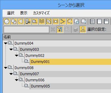 ビューポート イメージでは、ダミー オブジェクト 06、08、02 は互いに兄弟同士であるように見えます。しかし、実際の構成はもっと複雑です。ダミー オブジェクト 02 と 08 はダミー 03 の直接の子で、ダミー 06 はダミー 03 と同じ階層レベルにあるダミー 05 の直接の子です。