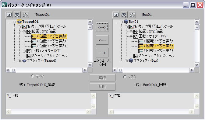 このボタンが有効なのは、選択したパラメータの間に既存のワイヤリングがある場合です。[切断](Disconnect)をクリックすると、ワイヤ コントローラを削除してマスター パラメータのアニメーション トラックと置き換えるか(双方向の場合)、標準のコントローラを置き換えます(単方向の場合)。
