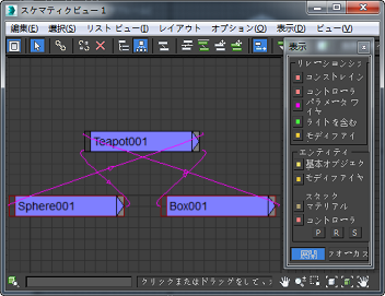 パラメータがシーン ノード内(オブジェクトに適用されるモディファイヤのパラメータに対するオブジェクトの位置など)でワイヤリングされている場合、ワイヤリングはスケマティク ビューで簡単にわからない場合があります。ただし、追加の[表示](Display)オプションを使用してワイヤリングをエクスポーズすることができます。