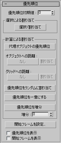 - 初期の優先順位の値を設定します。[選択による割り当て](Assign By Picking)、[オブジェクトへの距離](Proximity To An Object)、[グリッドへの距離](Proximity To A Grid)、および[優先順位をランダムに割り当て](Assign Random Priorities)の優先順位設定方法に適用されます。既定値は 0 です。