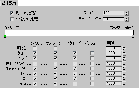 イメージが 32 ビット ファイル フォーマットでレンダリングされるときにイメージのアルファ チャネルにレンズ フレアが影響するかどうかを指定します。アルファ チャネルとは、イメージ内の透明度を示す特別な 8 ビットのカラー(256 色)です。アルファ チャネルは、1 つのイメージを別のイメージ上にシームレスに重ねて合成するのに使用されます。レンズ フレアまたはレンズ フレアを含むイメージを他のイメージの上に合成する場合、このチェック ボックスにチェックマークを付けます。32 ビット ファイルをレンダリングしない場合は、このチェック ボックスにチェックマークを付けないでください。