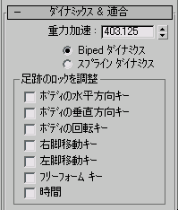 これらのパラメータで、character studio による新しい biped 重心キーの作成方法を指定します。これによって、biped での作業方法が決まります。[スプライン ダイナミック](Spline Dynamics)をオンにすると、新しく作成した足跡に対して、重心またはバランスを計算せずに重心キーが作成されます。スプライン補間の操作に慣れている場合は、この方法が簡単です。
