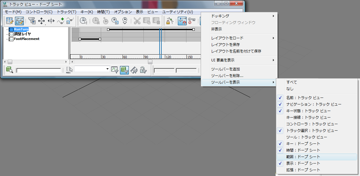 [範囲: ドープ シート](Ranges: Dope Sheet)を選択します。 3ds Max によって[範囲](Ranges)ツールバーが開きます。