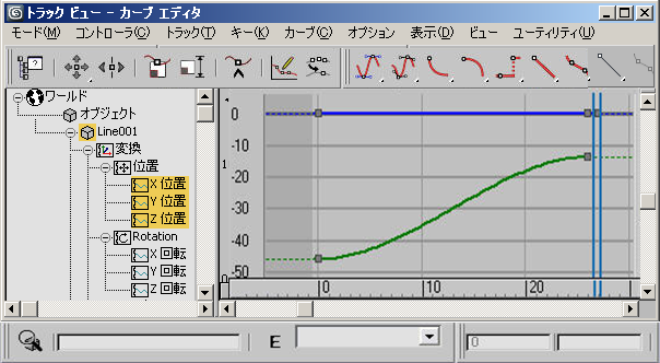 選択されたレイヤの下の CATParent にある[変換](Transform)ブランチのカーブ エディタに、変換ギズモのアニメーション キーが表示されます。また、範囲ビュー機能を使用すると、キーにすばやくアクセスできます。