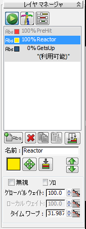 変換ギズモの名前は、「[現在のアニメーション レイヤ名](current animation layer name)変換」です。アニメーション レイヤの名前を変更したら、[レイヤ変換ギズモを表示](Display Layer Transform Gizmo)ボタンのオン/オフ操作をして、変換ギズモの名前を更新します。
