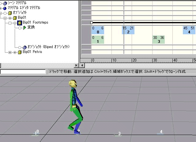 ビューポートでは、足跡は Biped の足の空間的な接地時間を表します。ビューポート内で足跡を移動、回転できます。トラック ビューでは、足跡はそれぞれの Biped の足の時間的な接地時間を表すブロックとして現れます。トラック ビュー内の時間で足跡を移動できます。Biped がどこに足を踏み出すかは、ビューポート内の足跡の位置と方向で制御します。