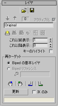 この領域にあるツールを使用すると、基本レイヤの IK コンストレイントを保持しながら、複数レイヤにわたって Biped をアニメートすることができます。また、シーン内の別の Biped を、現在の Biped の両手両足を再ターゲットするときの Biped リファレンスとして選択することもできます。