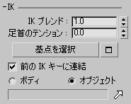 - [IK ブレンド](IK Blend)を 1、[前の IK キーに連結](Join To Previous IK Key)をオン、[IK]領域での選択を[オブジェクト](Object)にした状態で、Biped キーを設定します。