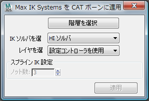 [Max IK を適用](Apply Max IK)ツールを使用すると、3ds Max の IK システムで CATRig をアニメートできます。スプラインを使用して長い尾を制御したり、指に HI/IK を使用してキャラクタの手の指や足の指を制御できます。