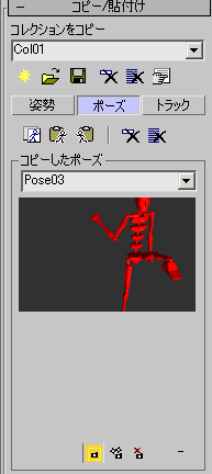 ドロップダウン リストからアクセスできる複数のバッファ内に、姿勢、ポーズ、トラックを作成および保存できます。このリストから項目を選択して、選択内容を表すサムネイル イメージを表示できます。また、その選択内容を同じ Biped またはシーン内のその他の Biped に貼り付けることができます。姿勢、ポーズ、またはトラックを選択して、これらの操作を適用できます。