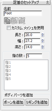 手のひらパラメータには、寸法と、指を追加および削除するためのリスト ボックスが含まれています。これは[足首のセットアップ](Ankle Setup)ロールアウトとまったく同じです。