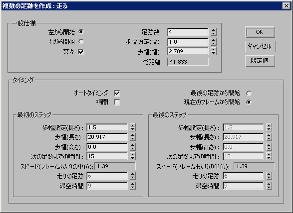 歩幅設定では Biped の解剖学的な観点からパラメータを記述し、歩幅(幅)では 3ds Max の単位で値を記述します。