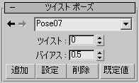 ここから、Biped の選択された四肢に適用するプリセットまたは保存済みのポーズを選択できます。既定値では、3 自由度の四肢では、上、前、横、下、後ろの 5 つのツイスト ポーズが選択可能です現在のツイスト ポーズの名前を変更することもできます。