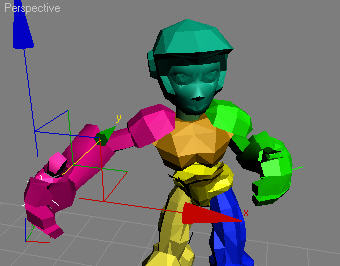 CAT の再ターゲット システムはすべてのリムで使用可能で、ハブを押したり、引いたり、回転したりすることによって、IK ソリューションとリムのボーンの角度を維持しようとします。これは、ルート オブジェクト(ハブ)の位置を変更せず、なおかつリムのボーンの角度を計算に入れずに、IK ターゲットだけを移動する従来の IK システムとは対照的です。