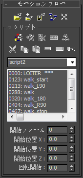 [モーション フロー](Motion Flow)ロールアウトの[スクリプト](Scripts)グループに表示されたサンプル スクリプト