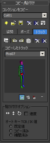 Biped トラックをコピーして貼付けするには、[トラック](Tracks)をオンにします。ロールアウト内の残りのコントロールが、トラックを操作するためのコントロールに変わります。