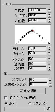 この新しいキーは、前のキーと次のキーの値の平均をとり、[前イーズ](Ease To)、[後イーズ](Ease From)の値を 5 と 25、[TCB]の値を 15、[IK ブレンド](IK Blend)の値を 0.25 に設定します。また、前のキーからボディ スペースが選択されます。