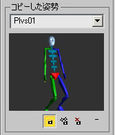 [コピー/貼付け](Copy/Paste)ロールアウトにあるコントロールを使用すると、Biped の 1 つのパーツから別のパーツに、または 1 つの Biped から別の Biped に、姿勢、ポーズ、またはトラック情報をコピーできます。