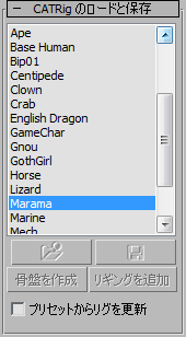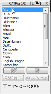 カスタム CATRig は、いつでも新しいプリセットとして保存して、後で再利用できます。この方法は CAT 全般で利用できます。必要としているものに最も近いプリセットをロードして、目的に合わせて編集し、その結果を新規プリセットとして保存します。