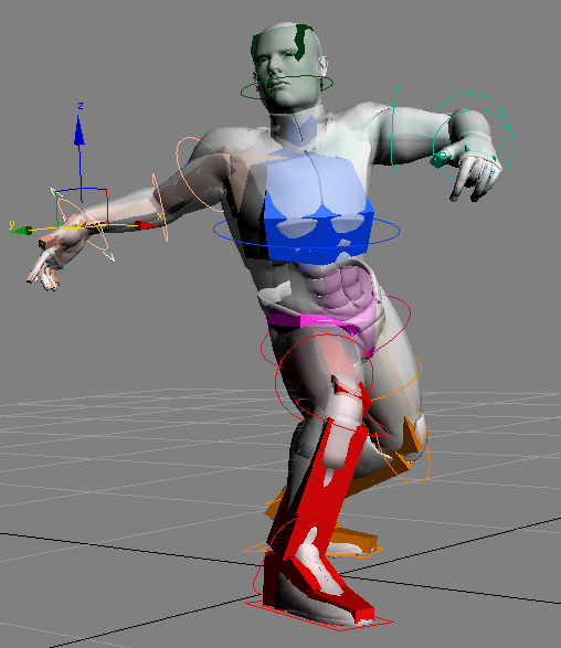 操作ギズモによって、よりすっきりとしたインタフェースでキャラクタを操作できます。CATBone はスキン メッシュの下に隠れていることが多く、ボーンを選択して編集しづらい場合があります。5 つのスプライン シェイプ(またはカスタム オブジェクト)から選択できるギズモがボーンの周囲に配置され、より簡単にキャラクタを掴んでインタラクティブに変換を適用できます。