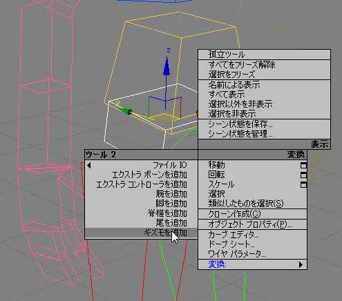 CATRig が設定モードのときに任意の CATBone を右クリックすると、[ツール 2](Tools 2)クアッド メニューに[ギズモを追加](Add Gizmo)コマンドが表示されます。