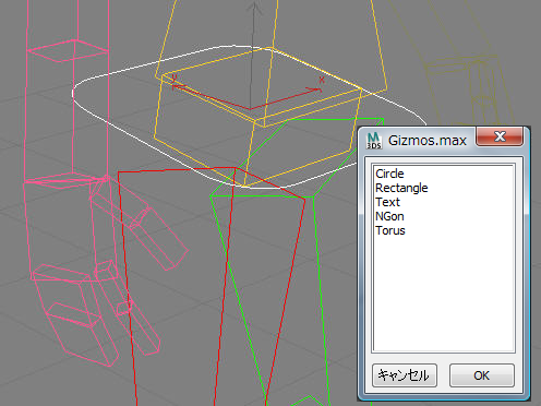 このファイルを開くと、リストを構成するシェイプ オブジェクトを確認できます。あらかじめ定義されているギズモ シェイプのリストに追加するには、独自のギズモをこのファイルに追加して、ファイルを保存し直します。任意のオブジェクト タイプをギズモとして使用できます。