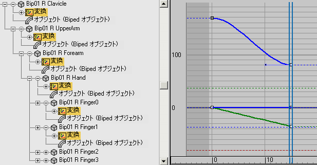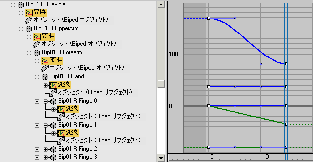 既定値では、指トラックは 1 つの手に対して 1 つです。すべての指キーは、Biped の親指の最初のリンクである Finger0 変換トラックに保存されます。