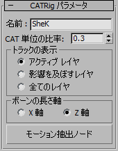 最初は、CAT は Z 軸を使用する設計となっており、当時はそれが論理的な設計と考えられていました。ところが、多くのゲーム開発者から、Z 軸から X 軸へ変更できるようにしてほしいとの要望が寄せられました。ほとんどの書き出し機能は、3ds Max のボーンや Biped、または MotionBuilder キャラクタを書き出す設計となっており、これらはすべて X 軸を使用します。多くの場合、ゲームの物理エンジンは、ボーンの位置合わせが X 軸でないと動作しません。