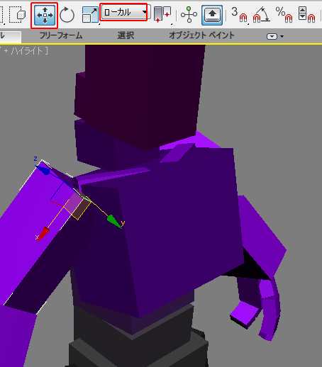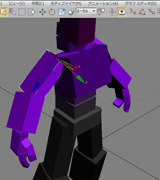 既定値では、CAT はすべてのボーンの長さ軸として X 軸を使用します。つまり、ボーンを選択して移動変換モードをアクティブにし、座標系を[ローカル](Local)に設定すると、長さ軸に指定された軸がボーンの長さに位置合わせされます。