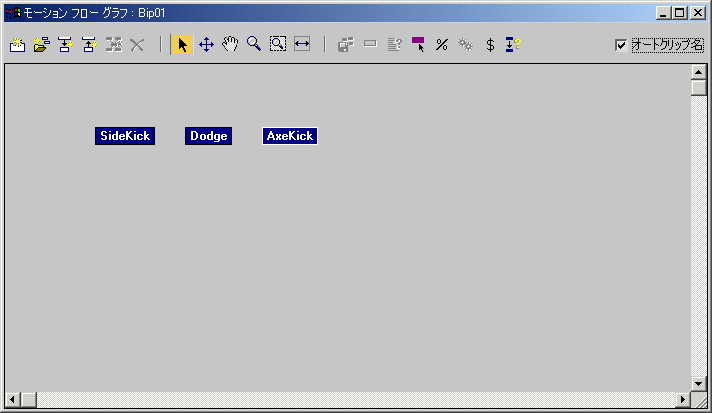 Biped で共有モーション フローを使用すると、グラフ ダイアログ ボックスのタイトルには、共有モーション フローの名前の前に「SHARED モーション フロー グラフ」と書かれます。共有(SHARED)モーション フローは 1 つのモーション フローを共有して複数の Biped を制御するのに使用されます。