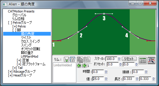 歩行サイクルは、4 つの膝の角度に分けられます。膝の角度の制御は、CATMotion エディタ内の[脚](Legs)の下にある、[膝の角度](KneeAngle)コントローラで行います。
