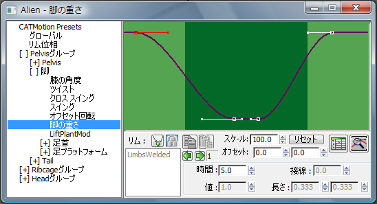 再ターゲットに重要なもう 1 つのコントローラは、[脚の重み](LegWeight)です。[膝の角度](KneeAngle)と同様、CATMotion エディタ内の[脚](Legs)の下にあります。