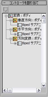 回転リストオンにすると回転コントローラが選択され、[Biped サブアニメーション](Biped SubAnim)トラックに集約されます。