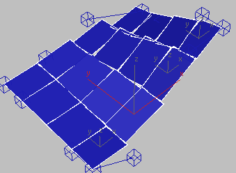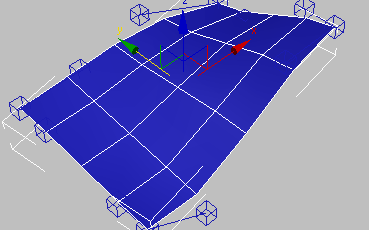 CATMuscle を構成するマッスルそのものは、矩形に並んだ複数の平坦なパネルと、マッスル全体の形状設定に使用する各コーナーのハンドルからなります。それぞれのコーナー ハンドルには、ベジェ カーブのノットのハンドルに似た 2 つの補助ハンドルがあり、サイドの形状を細かくコントロールできます。さらに、中間ハンドルを追加して、マッスルの内側の形状をコントロールすることもできます。これらのハンドルはすべてオブジェクト レベルで選択、移動できます(CATMuscle にはサブオブジェクト レベルはありません)。