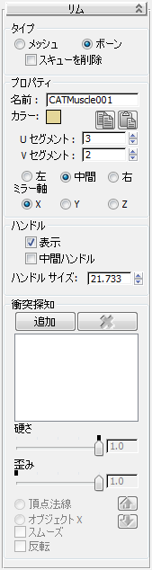 CATMuscle を作成したら、セグメント化の方法や、衝突検出のプロパティなどを変更できます。