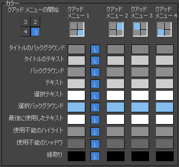クアッド メニュー要素のカラーがロックされていると([L]ボタンが押された状態)、どのクアッド メニューでも同一カラーが使用されます。1 つのクアッド メニューのカラーを変えると、すべてのクアッド メニューのカラーが変わります。