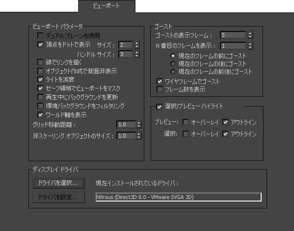 [基本設定](Preference Settings)ダイアログ ボックスの[ビューポート](Viewports)パネルで、ビューポートの表示と動作のオプションを設定します。また、現在のディスプレイ ドライバを設定できます。