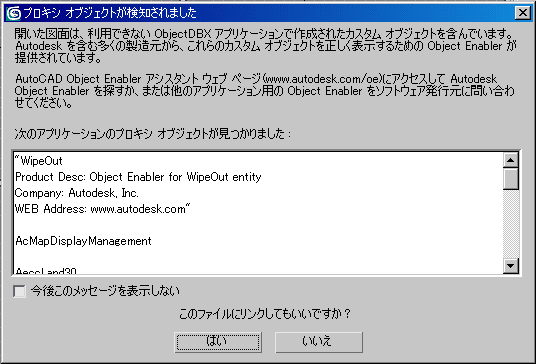 ファイル リンク マネージャを使用してシーンに DWG ファイルをアタッチする場合に、[プロキシ オブジェクトが検知されました](Proxy Objects Detected)ダイアログ ボックスが表示されることがあります。これは、3ds Max で編集するために特別な Object Enabler を必要とするカスタム オブジェクトが図面内にあることを意味します。